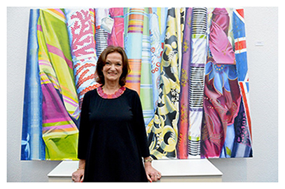 Die Faszination für Textiles erklärt die Künstlerin damit, dass sie damit aufgewachsen ist - die Mutter war Modedesignerin. Viele unterschiedliche Stoffe verwendet sie für ihre Malerei, glänzend, matt, rau, seidig, mit Spitzen oder Ornamenten verziert, einfarbig, geblümt oder gestreift. Mit großer Genauigkeit arbeitet sie an der malerischen Ausarbeitung und offenbart auch hierin ihre Faszination für die Vielfalt gewebter Dinge.